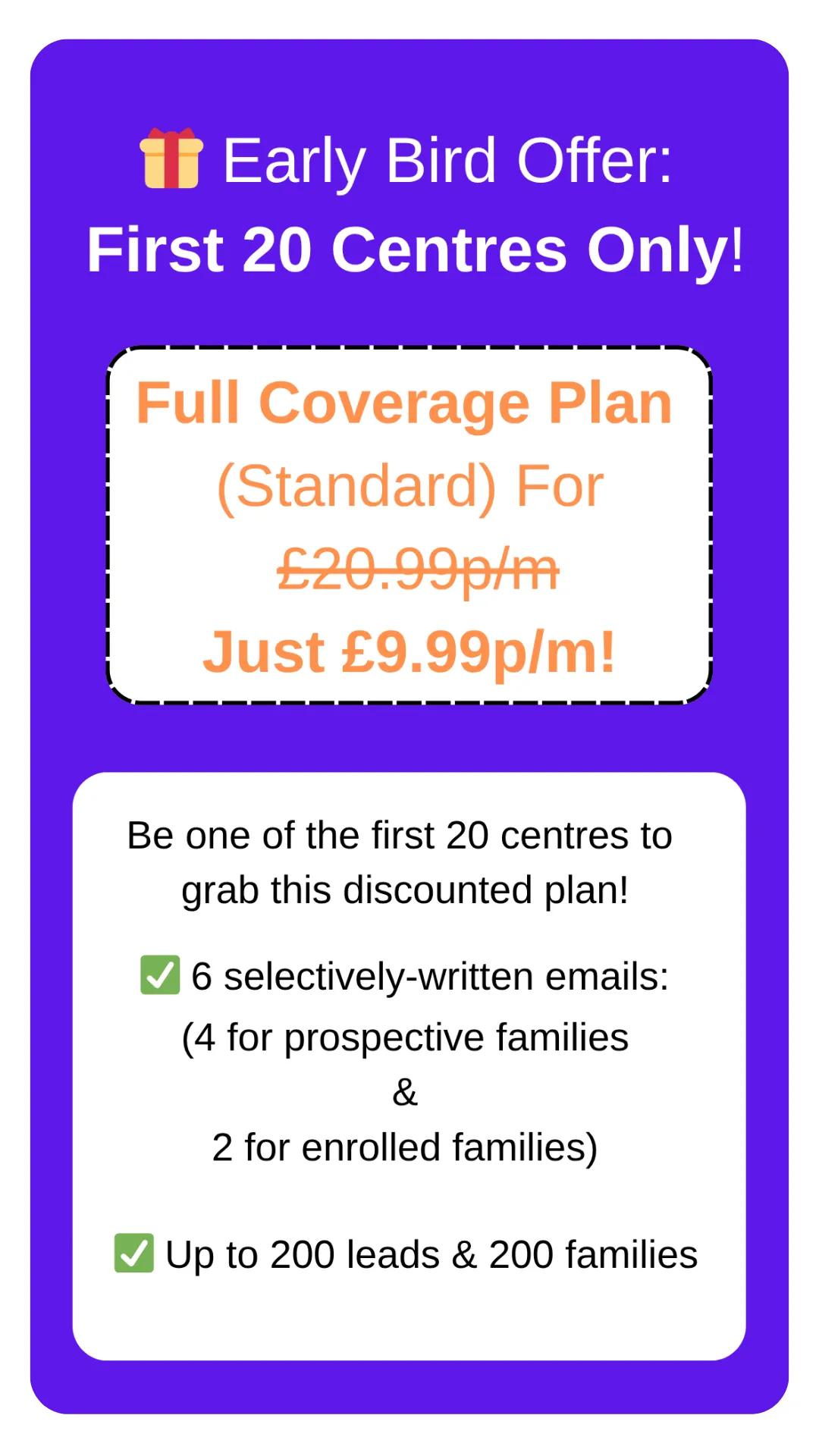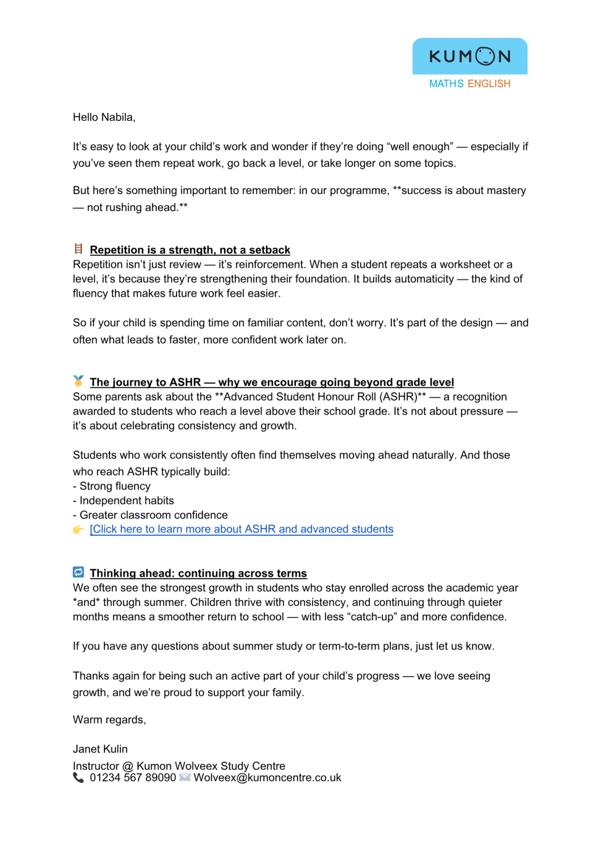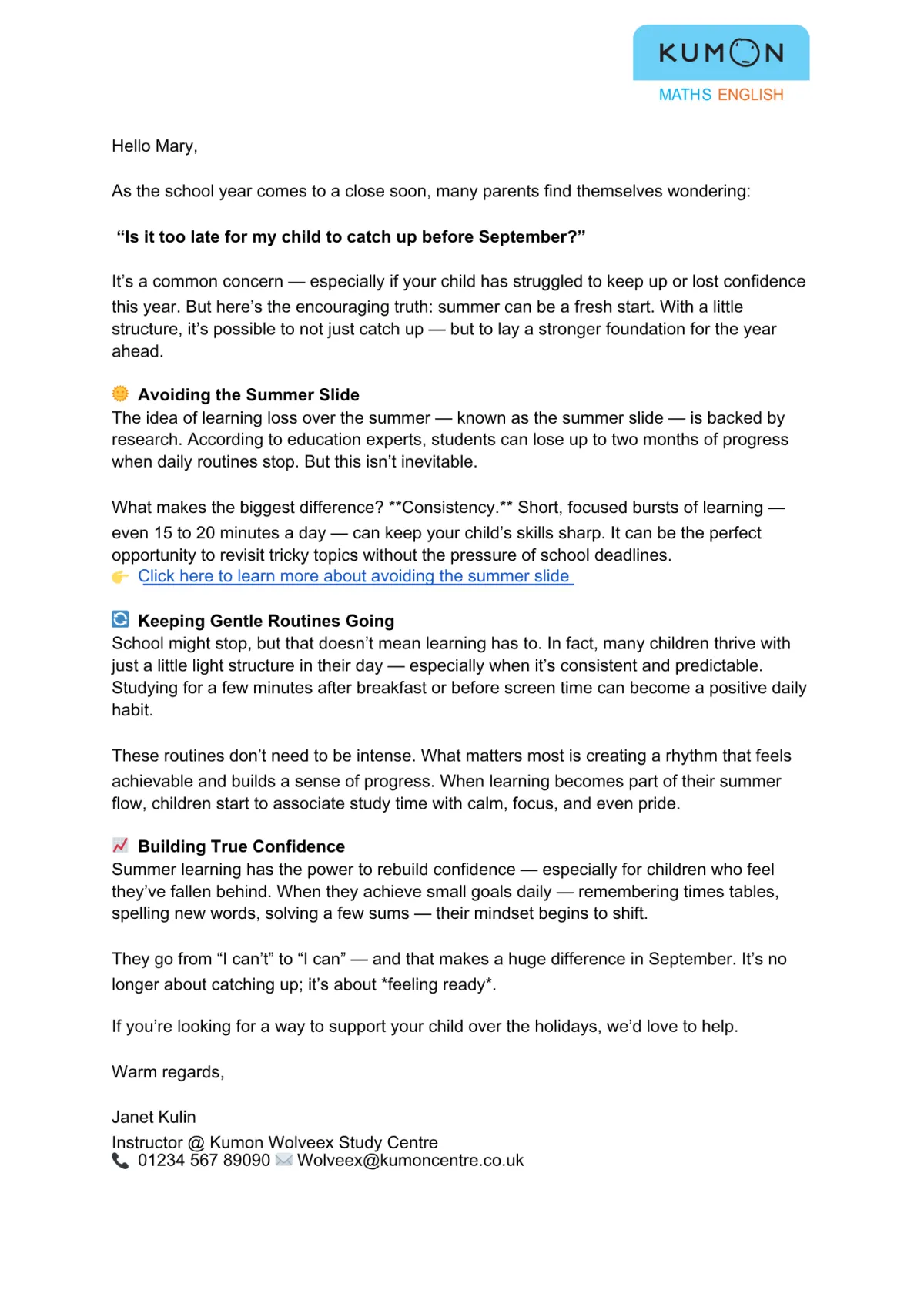 We currently don't provide customised email campaigns for Kumon Instructors in the UK. Our current offerings are low-frills, standardised services — the same expertly-written email goes out to all subscribing centres with light personalisation (centre name, instructor name, contact details).